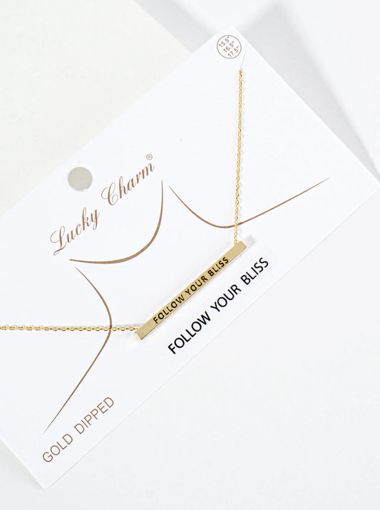 Follow Your Bliss Engraved 18K Gold Dipped Horizontal Brass Bar Pendant Inspirational Necklace