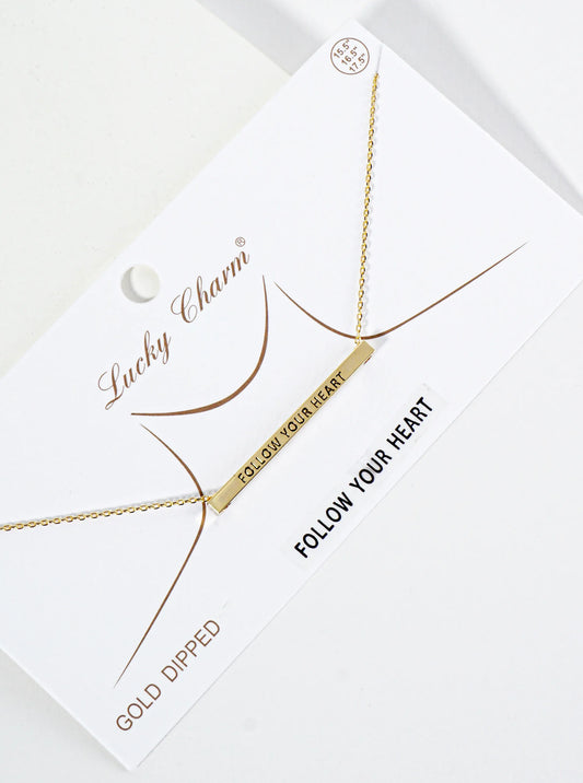 Follow Your Heart Engraved 18K Gold Dipped Horizontal Brass Bar Pendant Inspirational Necklace