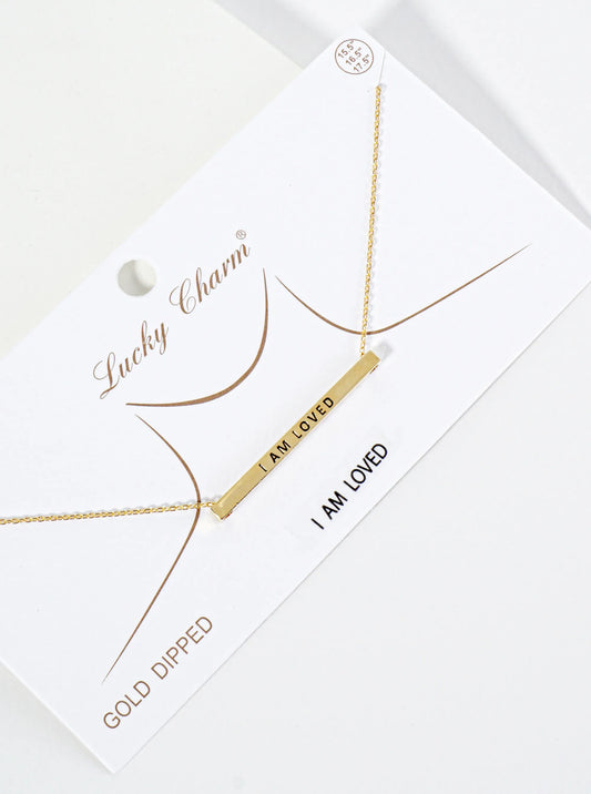 I Am Loved Engraved 18K Gold Dipped Horizontal Brass Bar Pendant Inspirational Necklace
