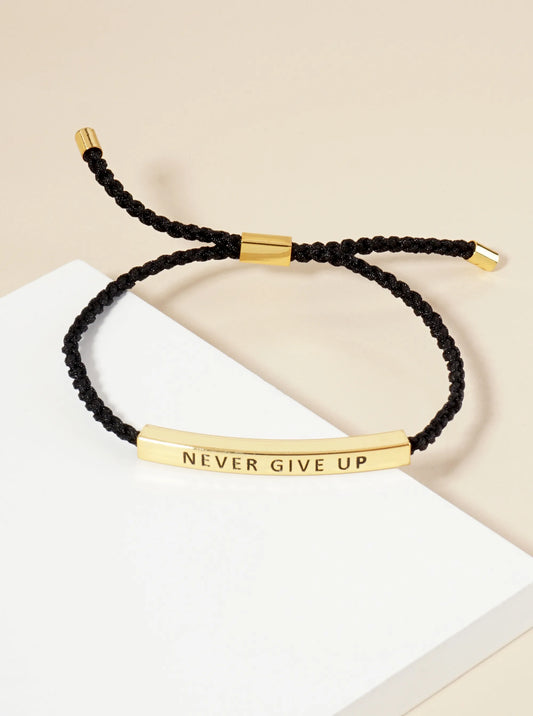 Never Give Up Engraved 18K Gold Dipped Curved Brass Tube Bar Adjustable Pull Tie Bracelet