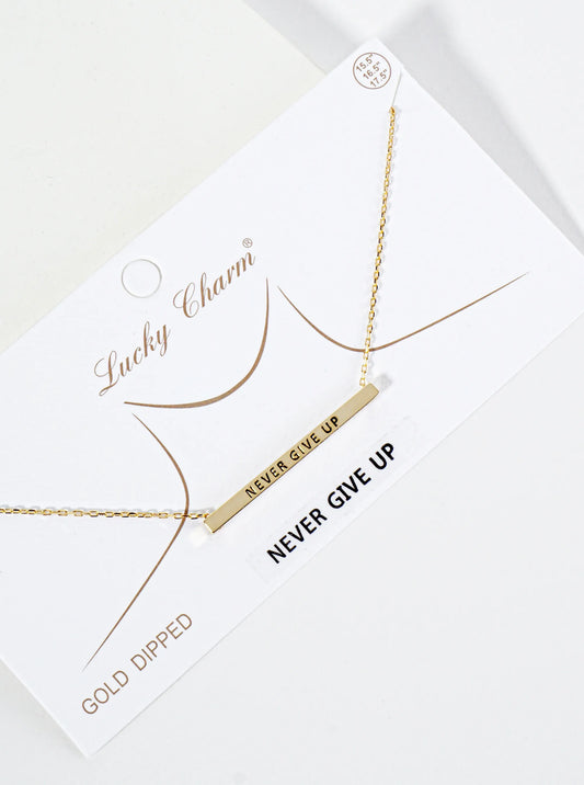 Never Give Up Engraved 18K Gold Dipped Horizontal Brass Bar Pendant Inspirational Necklace