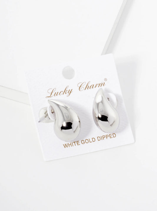 White Gold Dipped 1 Inch Hollow Puffy Teardrop Stud Earrings