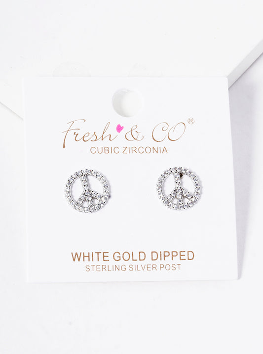 White Gold Dipped 10mm CZ Pave Peace Symbol Stud Earrings