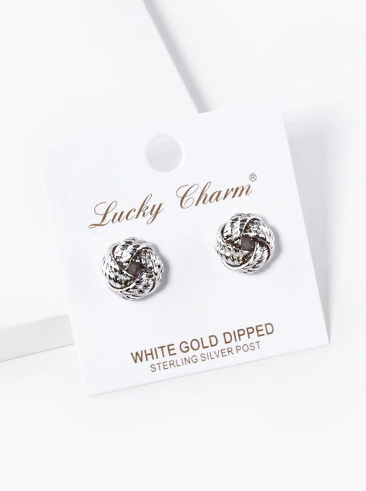 White Gold Dipped 11mm Textured Brass Love Knot Stud Earrings