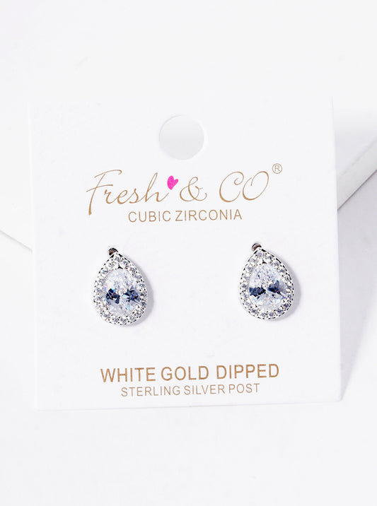 White Gold Dipped 17mm CZ Pave Teardrop Post Stud Earrings