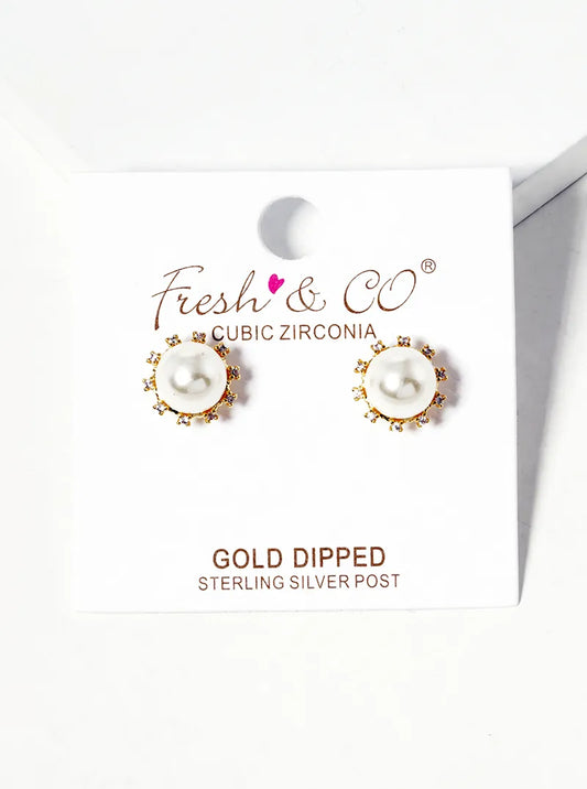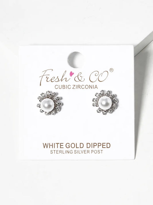 White Gold Dipped 8mm Pearl With CZ Stones Post Stud Earrings