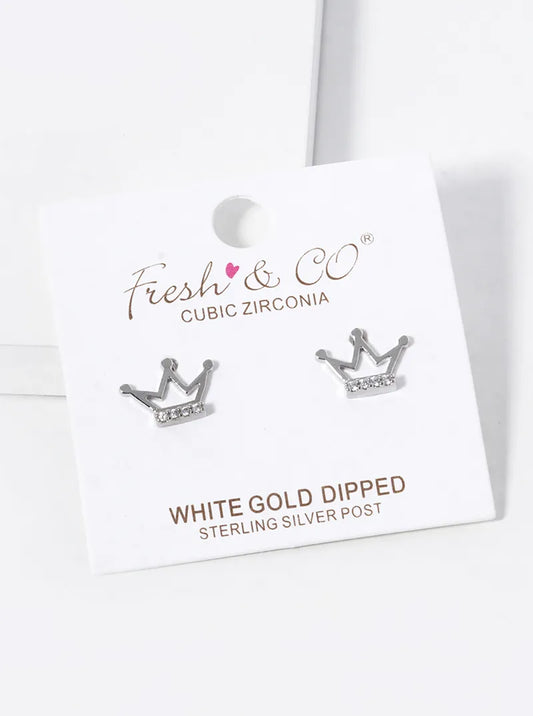 White Gold Dipped 8mm CZ Crown Stud Earrings