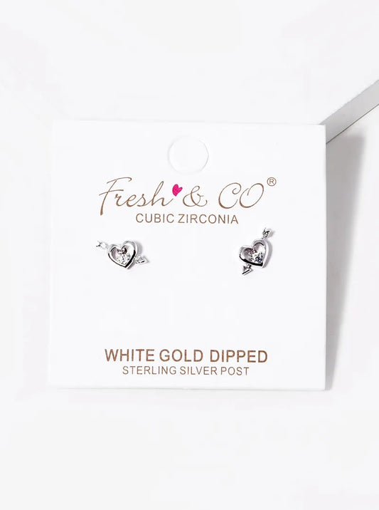 White Gold Dipped CZ Cupids Heart Stud Earrings