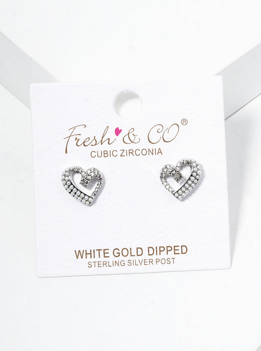 White Gold Dipped CZ And Glass Pearl Beaded Heart Post Stud Earrings