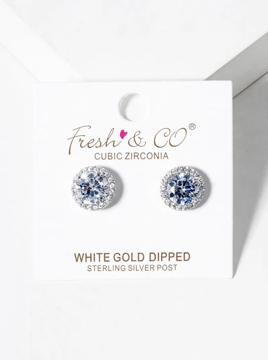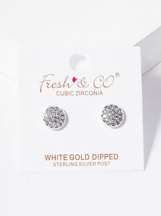 White Gold Dipped CZ Pave 8mm Round Stud Earrings
