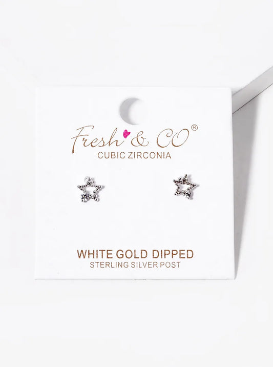 White Gold Dipped CZ Dainty Textured Star Stud Earrings