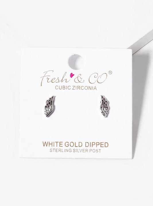 White Gold Dipped CZ Pave Angel Wings Stud Earrings