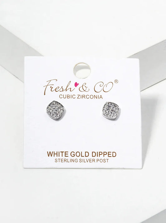 White Gold Dipped CZ Pave Dainty Rounded Square Post Stud Earrings