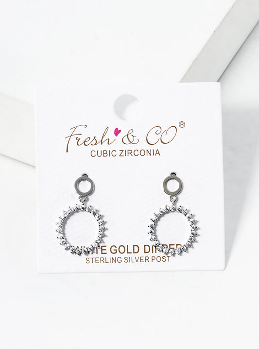 White Gold Dipped CZ Pave Circle Drop Post Earrings