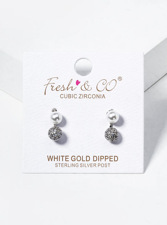 White Gold Dipped CZ Pave Ball Drop Pearl Post Stud Earrings