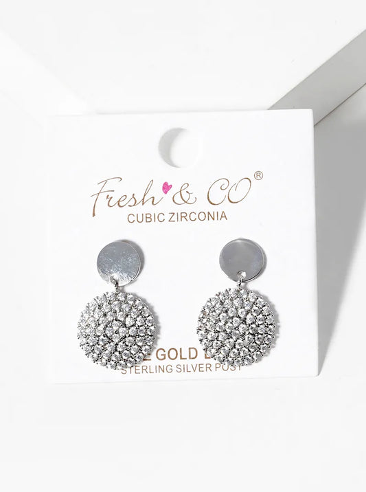 White Gold Dipped CZ Pave Circle Drop Dangle Post Earrings