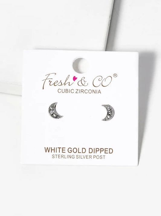White Gold Dipped CZ Pave Crescent Moon Post Stud Earrings