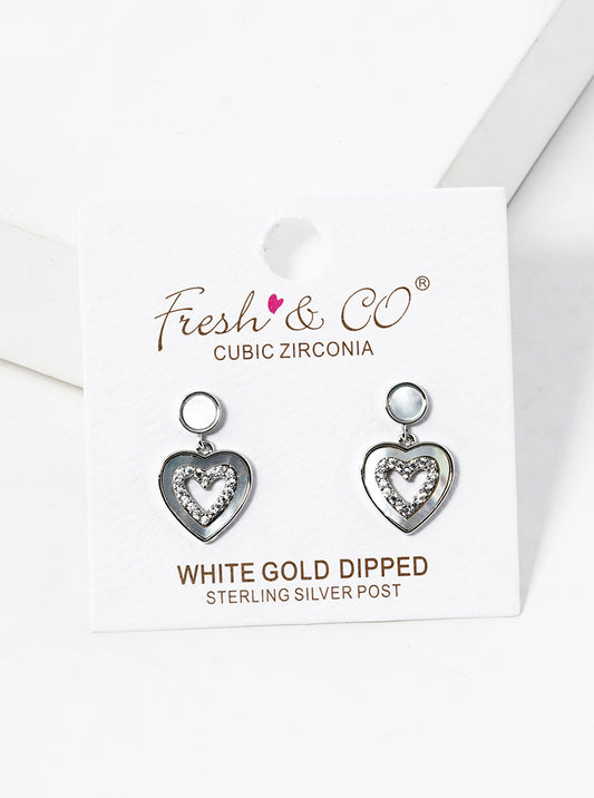 White Gold Dipped CZ Pave MOP Heart Drop Post Stud Earrings