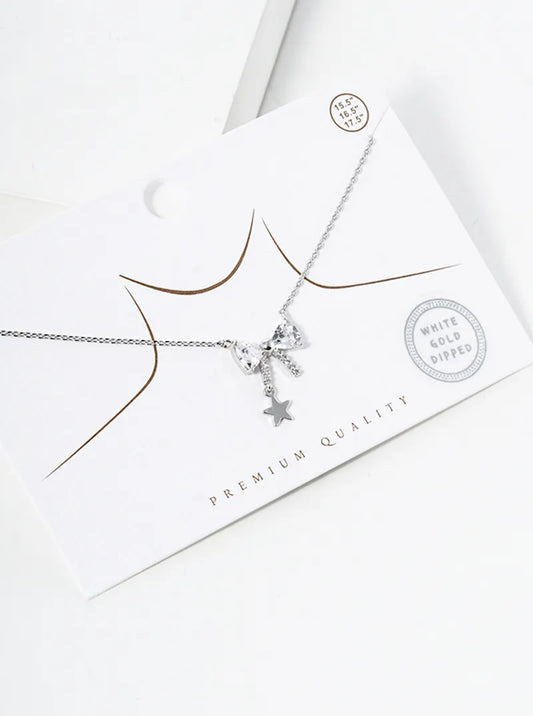 White Gold Dipped CZ Pave Ribbon Bow With Star Drop Pendant Necklace