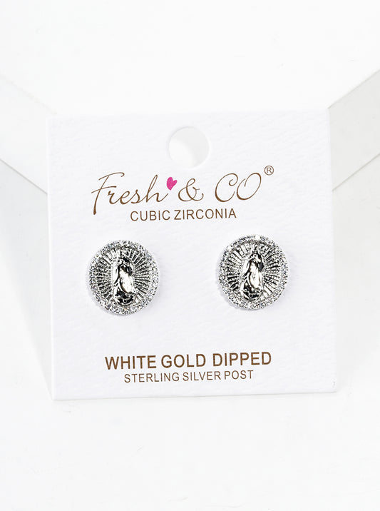 White Gold Dipped CZ Pave Round Virgin Mary Post Stud Earrings