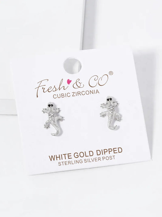 White Gold Dipped CZ Pave Lizard Stud Earrings