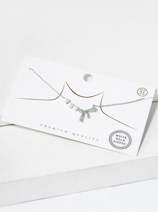 White Gold Dipped CZ Pave Ribbon Bow Pearl Pendant Necklace
