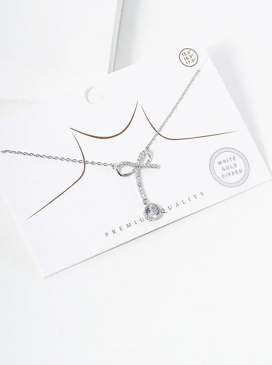 White Gold Dipped CZ Pave Ribbon Bow Pendant Necklace