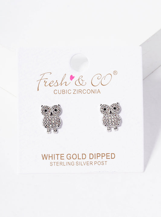 White Gold Dipped CZ Pave Owl Post Stud Earrings