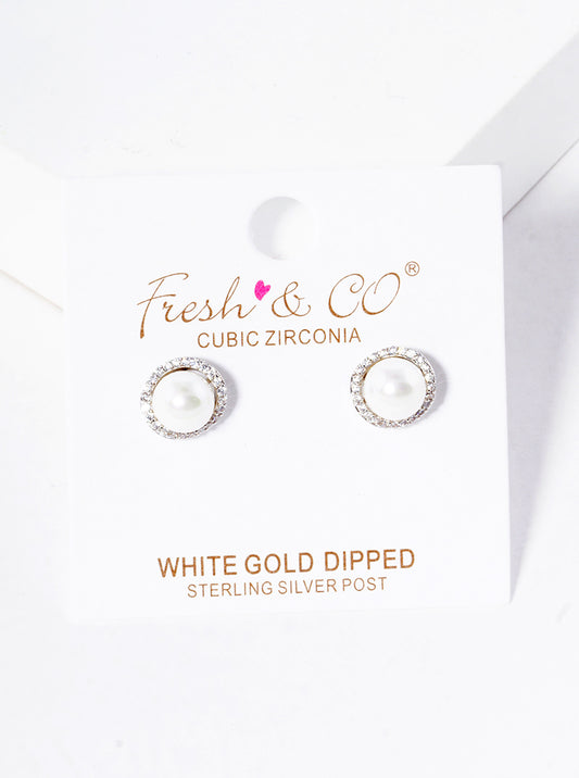 White Gold Dipped CZ Pave Pearl Post Stud Earrings