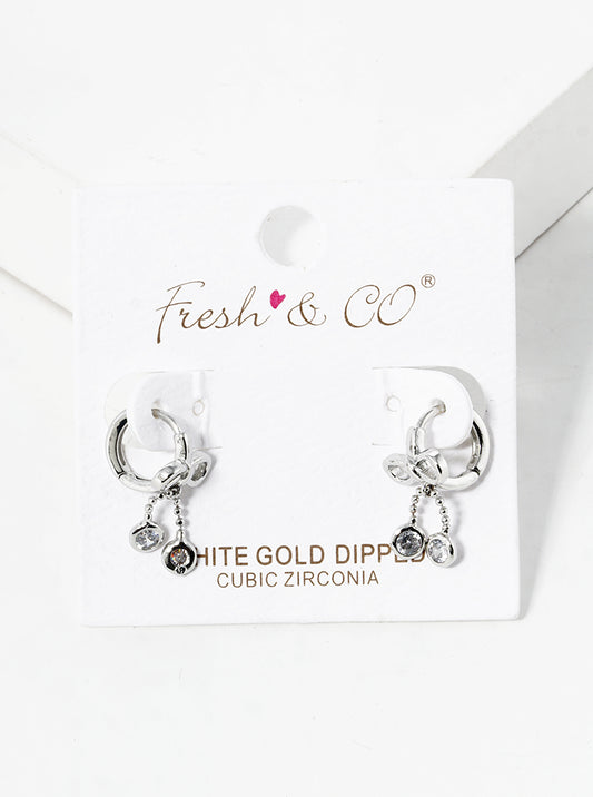White Gold Dipped CZ Ribbon Bow Drop 8mm Huggie Hoop Earrings