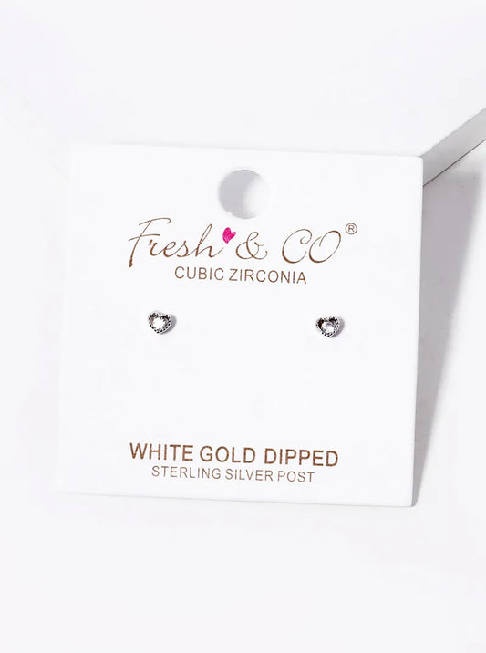 White Gold Dipped Dainty CZ Heart Post Stud Earrings