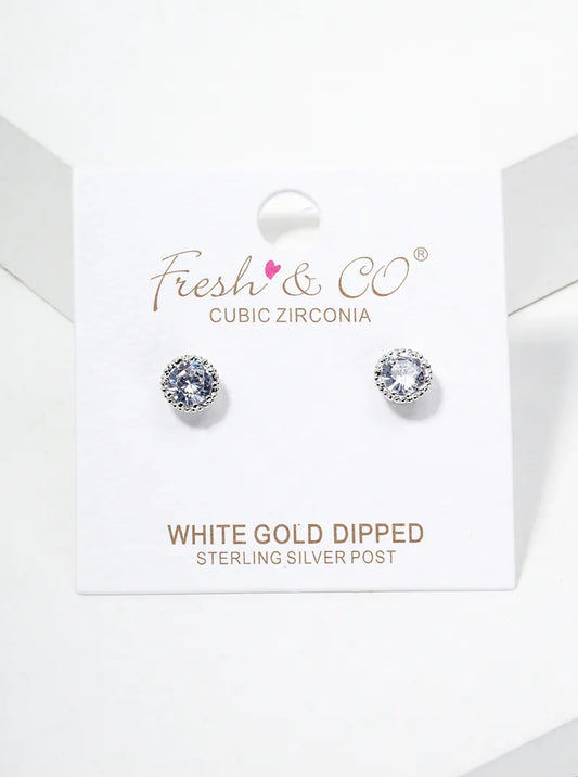 White Gold Dipped Dainty Round CZ Post Stud Earrings