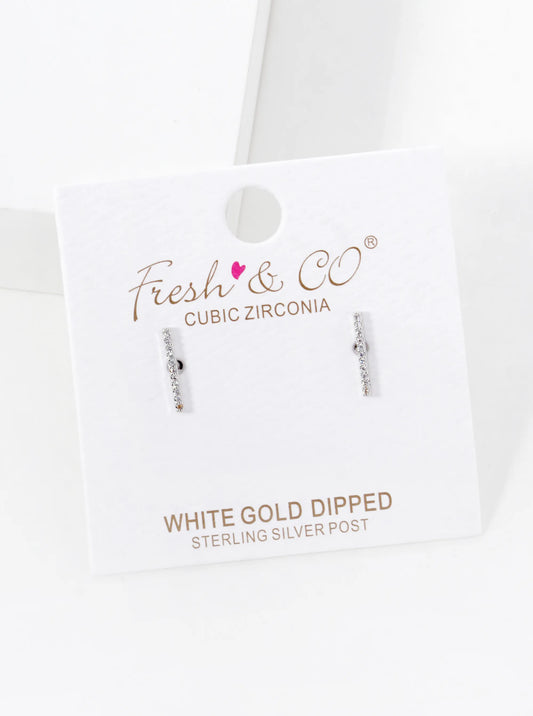White Gold Dipped Delicate CZ Pave Bar Stud Earrings
