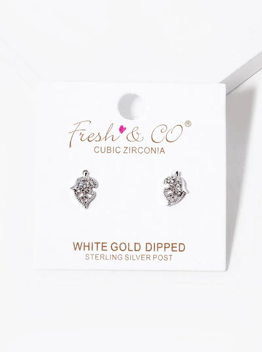 White Gold Dipped Delicate CZ Pave Leaf Stud Earrings