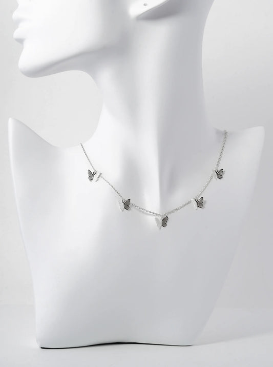 White Gold Dipped Delicate Textured Brass Five Butterflies Pendant Necklace
