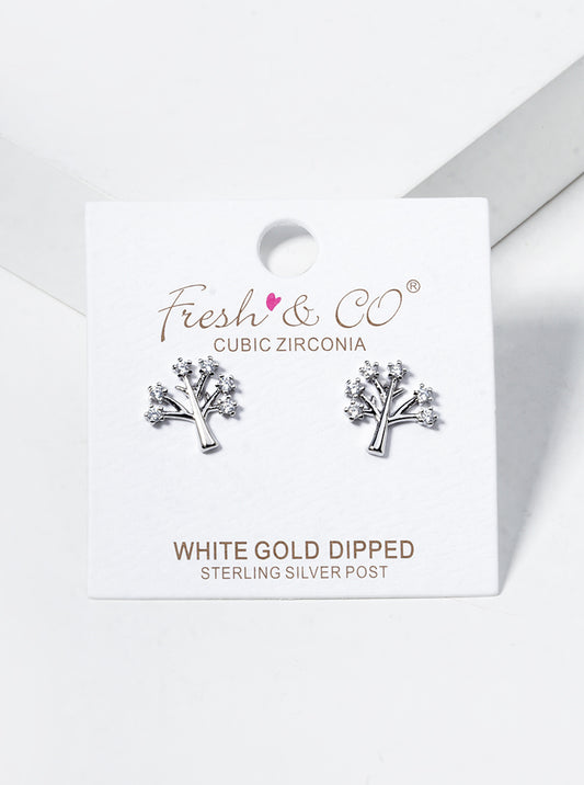 White Gold Dipped CZ Tree Of Life Post Stud Earrings