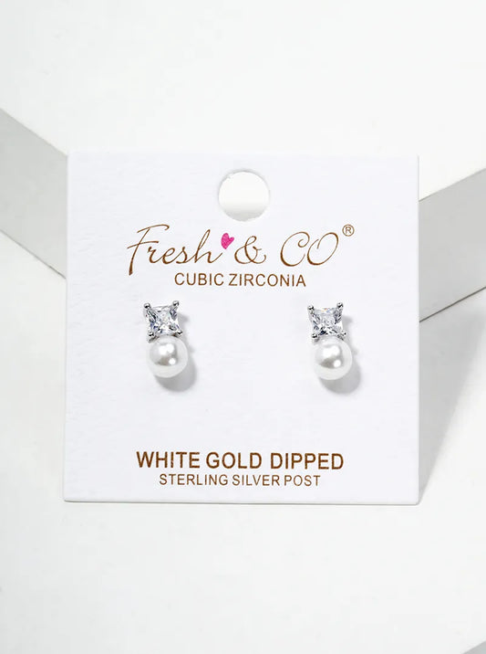 White Gold Dipped Dainty CZ Stone Pearl Drop Post Stud Earrings