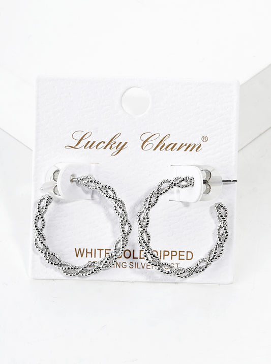 White Gold Dipped Twist Textured Metal 20mm Open Hoop Earrings