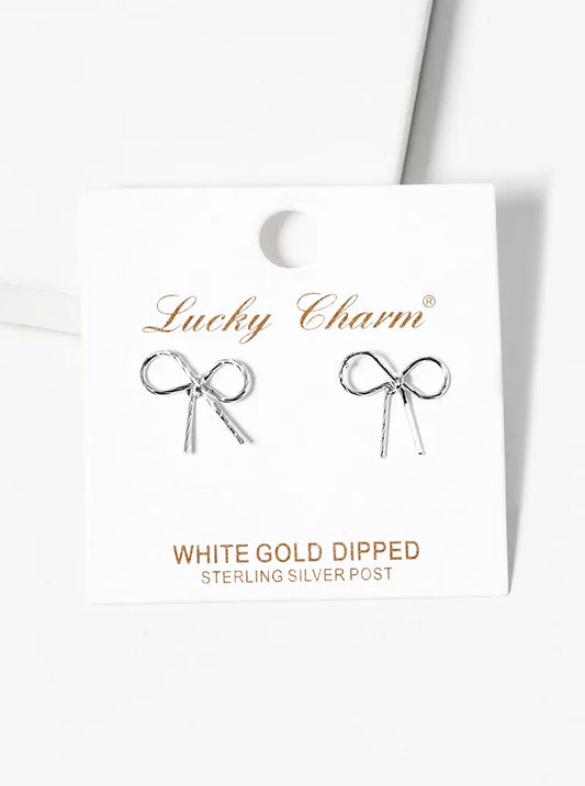 White Gold Dipped Textured Wire Ribbon Bow Post Stud Earrings