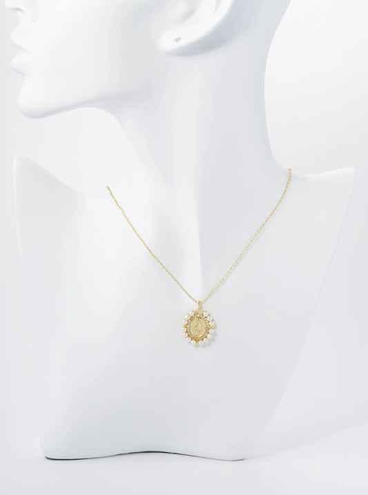 18K Gold Dipped 3mm Pearl Beaded CZ Oval Miraculous Medal Pendant Religious Necklace