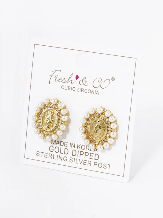 18K Gold Dipped 3mm Pearl Beaded CZ Oval Miraculous Medal Stud Earrings