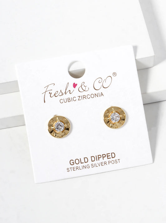 18k Gold Dipped 9mm Roman Numerals Engraved CZ Stud Earrings