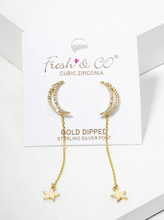 18k Gold Dipped Crescent Moon With Star Drop Dangle Post Earrings