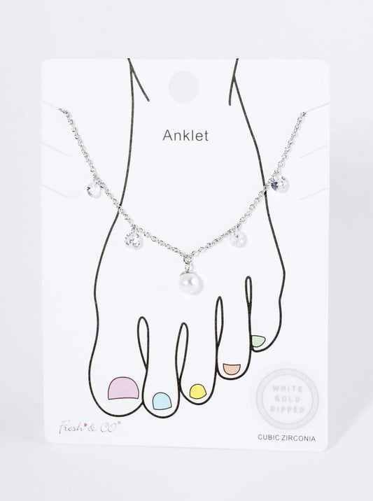 18K Gold Dipped Cubic Zirconia Pearl Bead Charm Brass Chain Anklet