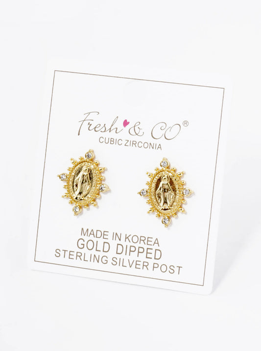 18K Gold Dipped CZ Oval Miraculous Medal Religious Stud Earrings