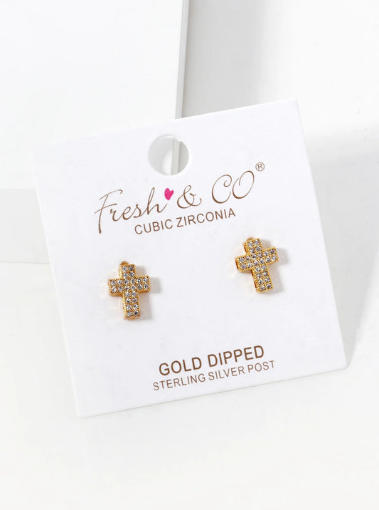 18K Gold Dipped CZ Pave 10mm Cross Stud Earrings