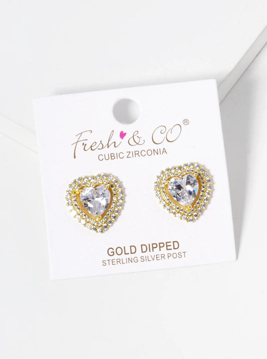 18k Gold Dipped CZ Pave 3-Prong Heart Stone Stud Earrings