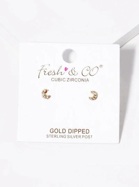 18k Gold Dipped CZ Pave 4mm Dainty Moon Stud Earrings