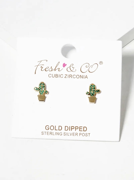 18K Gold Dipped CZ Pave Cactus Post Stud Earrings