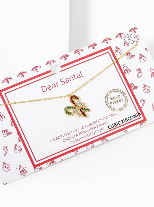 18K Gold Dipped CZ Pave Christmas Candy Cane Pendant Necklace